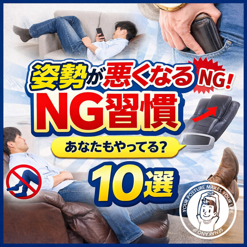 姿勢が悪くなる原因は、日常の何気ない習慣にあります。あぐら、足組み、座椅子、後ろポケットの財布など、姿勢を崩すNG習慣10選を姿勢治療家・仲野孝明がわかりやすく解説。背伸びだけでは変わらない人におすすめです。